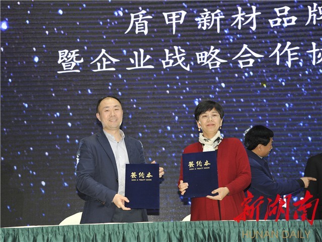 精彩生动的推介让在场企业家一致看好该产品的应用空间和市场潜力,海军装备部、中国直升机研究所、北京航天科工空间工程发展有限公司、雅迪科技集团有限公司、湖南长重机器股份有限公司等9家企业和单位随即与盾甲新材签订了战略合作协议。