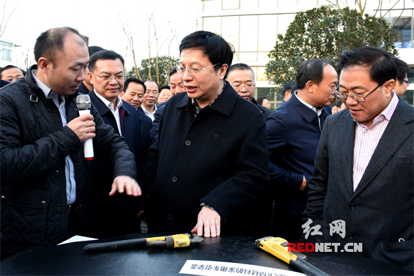 12月18日,湖南省委常委、长沙市委书记胡衡华(前排中)率市观摩团走进长沙金霞经济开发区军民融合产业示范园。图为园区相关负责人向观摩团介绍盾甲新材最新研发的韧涂覆材料特性。邓正可 摄